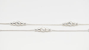 This elegant pair of silver anklets is designed to blend simplicity with timeless charm. Each anklet features a sleek snake-chain pattern adorned with smooth and textured silver beads at intervals, creating a graceful and refined look. Perfect for both daily wear and festive occasions, this payal adds a subtle sparkle to your step.