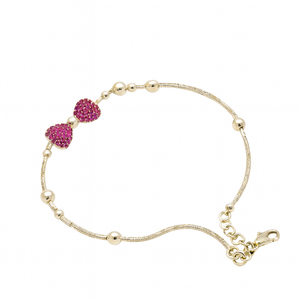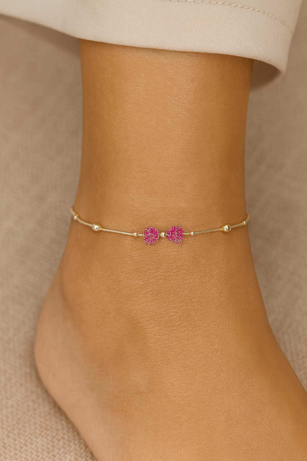 Adorn your ankles with a playful touch of sparkle and color with the Blossom Bow Anklet. Crafted in sterling silver, this delightful piece features twin bow-shaped centerpieces encrusted with vibrant magenta cubic zirconia stones—each bow symbolizing charm and femininity. The sleek silver chain is accented with faceted beads, creating a look that’s both chic and versatile for any occasion.