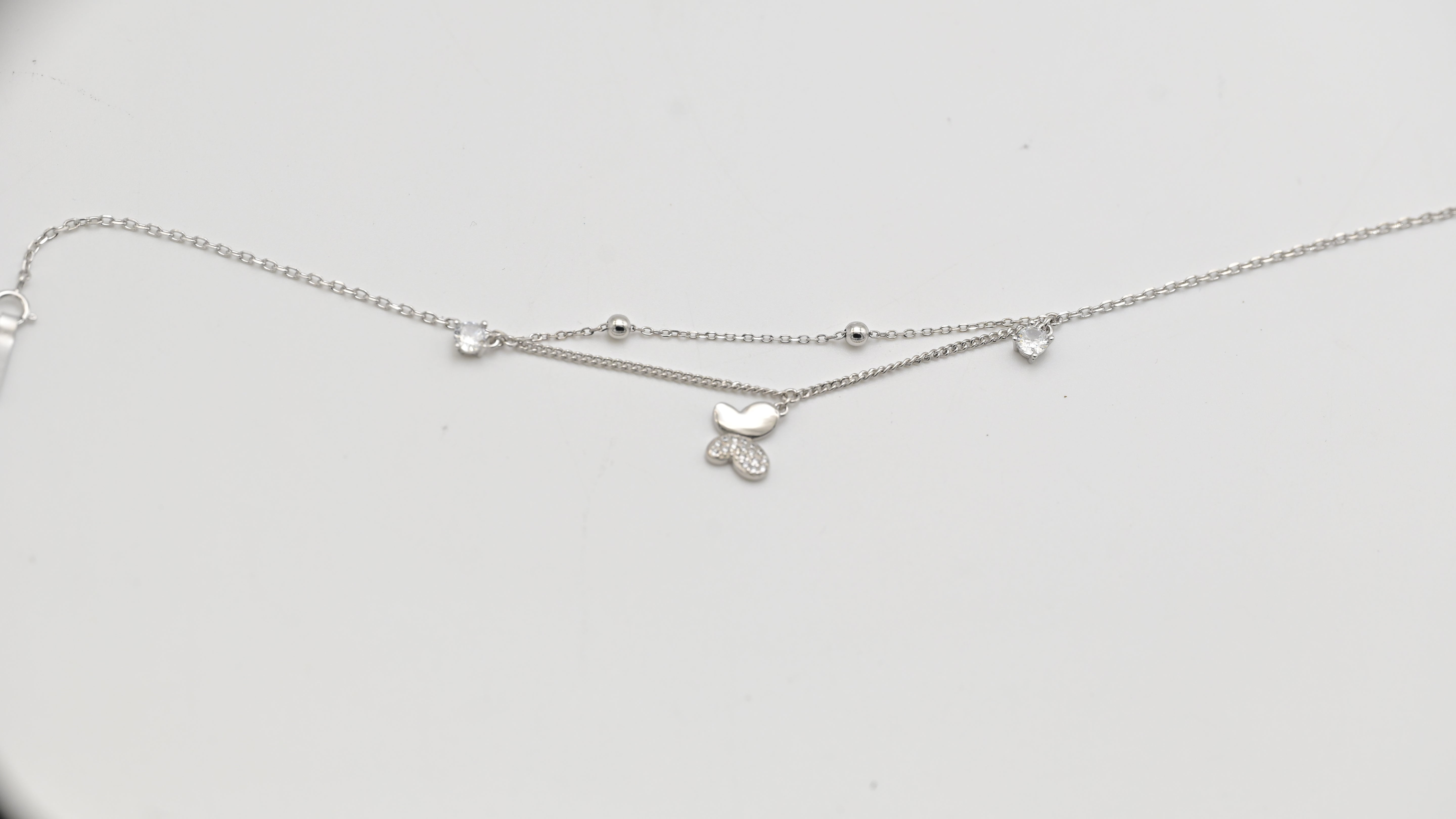 Delicate, graceful, and endlessly charming — Miora’s 925 Sterling Silver Butterfly Anklet brings a touch of sparkle to your every step. Featuring a dual-chain design, it’s adorned with a shimmering butterfly charm and sparkling cubic zirconia drops that capture the light beautifully. The minimal yet elegant style makes it perfect for both daily wear and special occasions.