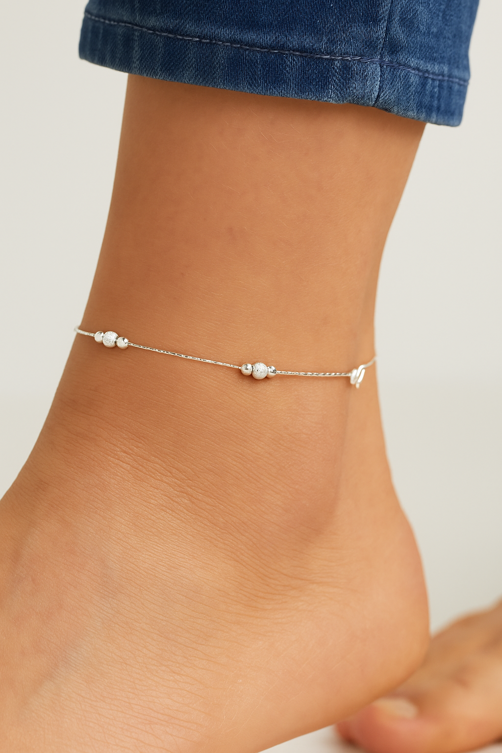 Add a touch of understated elegance to your everyday look with this beautifully crafted sterling silver anklet. Designed with alternating smooth and textured silver beads along a sleek, reflective chain, this piece offers a perfect blend of simplicity and sophistication. Its lightweight and versatile design makes it ideal for daily wear or layering with other anklets for a chic, modern style.