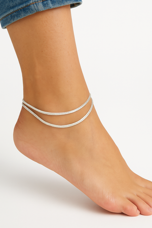 Add a touch of elegance to your traditional look with this beautifully crafted Sterling Silver Payal Anklet . Designed with a double chain pattern,this anklet features smooth, flexiblelinks that rest comfortably around your anklet . The ends are adorned with small silver beads and intricate charms, adding a soft , melodious jingle with every step. Prefect for dailywear or festive occasions , this payal combines simplicity and sophistication in one timeless design