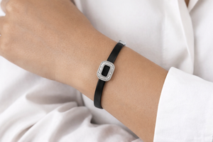 Sleek, bold, and effortlessly refined, this Sterling Silver Black Strap Bracelet is designed for understated sophistication. The smooth black strap is accented with a rectangular silver centerpiece adorned with subtle sparkle, creating a striking contrast that feels modern yet timeless.