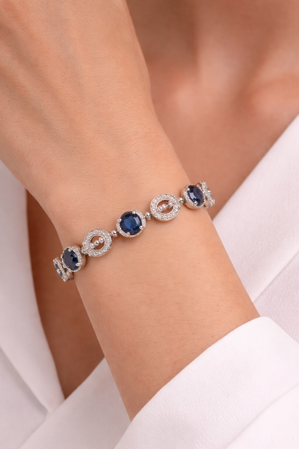 Add timeless elegance to your jewelry collection with this stunning silver bracelet featuring deep royal blue crystals set in a beautifully detailed circular design. The alternating pattern of sparkling blue stones and intricately crafted silver discs creates a luxurious and refined look, perfect for both formal occasions and everyday sophistication. Designed to sit comfortably on the wrist, this bracelet offers brilliance, durability, and a graceful finish that complements any outfit effortlessly.
