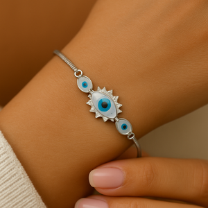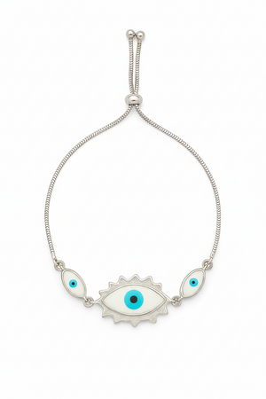 Embrace elegance and protection with the Miora Evil Eye Sparkle Protection Bracelet. This refined piece features a radiant evil eye centerpiece, symbolizing luck and warding off negative energy. Surrounded by shimmering cubic zirconia stones and set in polished sterling silver, it perfectly blends spirituality with modern sophistication. Adjustable for a comfortable fit, this bracelet adds a touch of charm and meaning to any look — from everyday wear to special occasions.