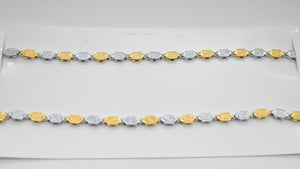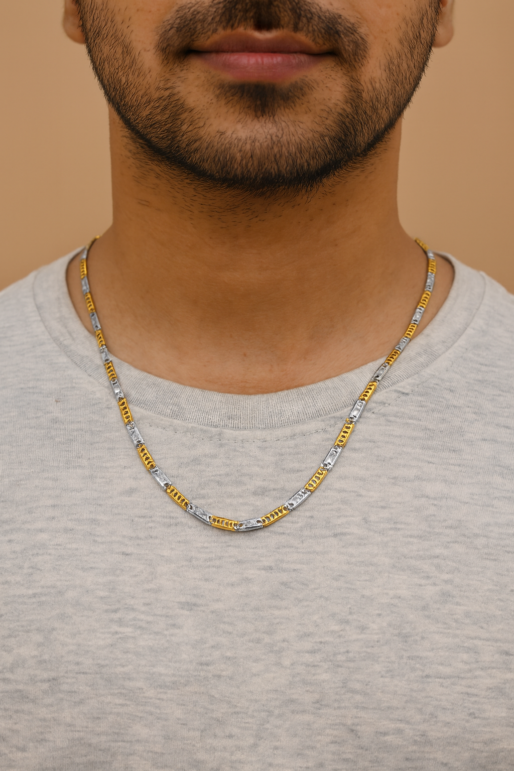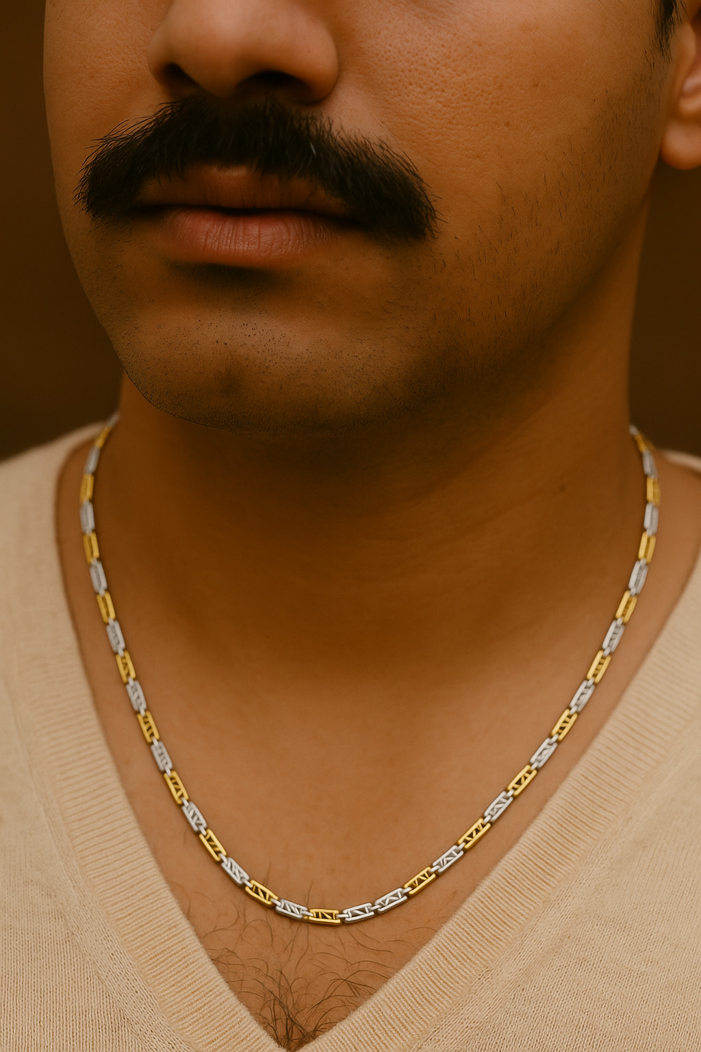 This handcrafted piece features alternating gold and silver geometric links, each engraved with intricate motifs that reflect timeless craftsmanship. The dual-tone finish adds a luxurious contrast, making it the perfect accessory to enhance both classic and modern looks.