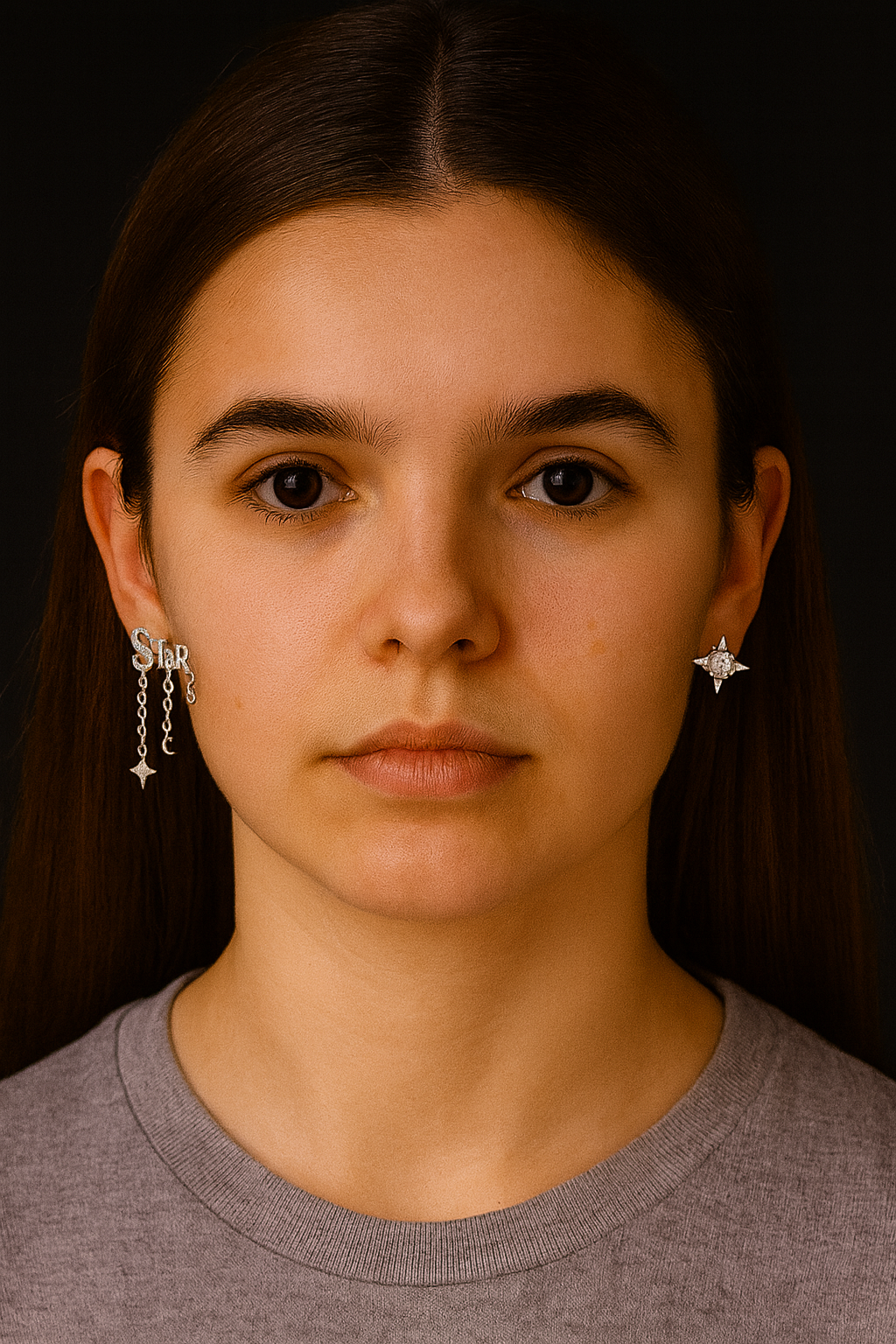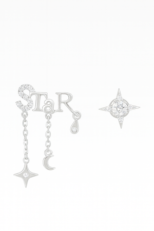 Light up every room with the “STAR” Celestial Dangle Earrings, inspired by the moonlit sky. With twinkling crystals, delicate chains, and symbolic celestial charms, this pair embodies both elegance and fantasy. The asymmetry enhances its charm — one side spells out STAR with hanging motifs, while the other glows with a radiant stud.