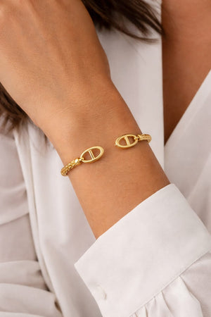 The sleek oval end accents lend a modern touch, while the open cuff silhouette ensures comfort and effortless wear. Whether styled for everyday elegance or paired with evening ensembles, this bracelet is a versatile essential for the modern woman.