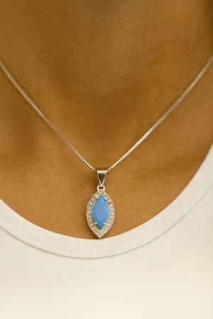 Graceful and captivating, the Blue Marquise Pendant Necklace embodies serenity and sophistication. The marquise-shaped blue stone glows with calm energy, encased within a shimmering halo of fine zirconia that adds a touch of luxury.