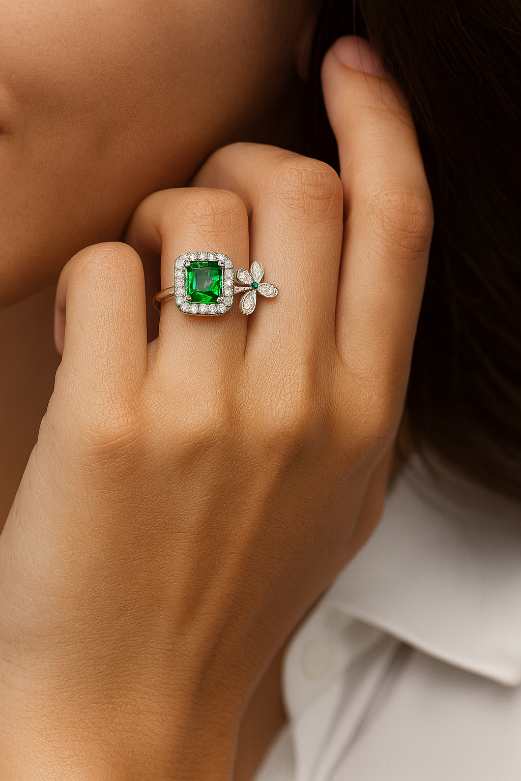 Experience timeless sophistication with Miora’s Sterling Silver Emerald Flower Ring, a design that beautifully combines nature-inspired artistry with luxurious detail. Featuring a striking emerald-cut green gemstone framed by a halo of dazzling cubic zirconia, this piece captures the essence of freshness and charm.