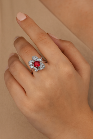 Each detail reflects grace and craftsmanship, making it a stunning accessory for any occasion — from romantic evenings to festive celebrations. The vivid ruby center adds a touch of passion and power, while the silver sparkle enhances its timeless beauty.