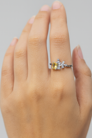 Radiate positivity and grace with Miora’s Sterling Silver Yellow Cushion-Cut Ring, a delicate yet dazzling piece inspired by the warmth of sunlight. The soft yellow gemstone glows with cheerful brilliance, complemented by sparkling white cubic zirconia accents on a sleek silver band.