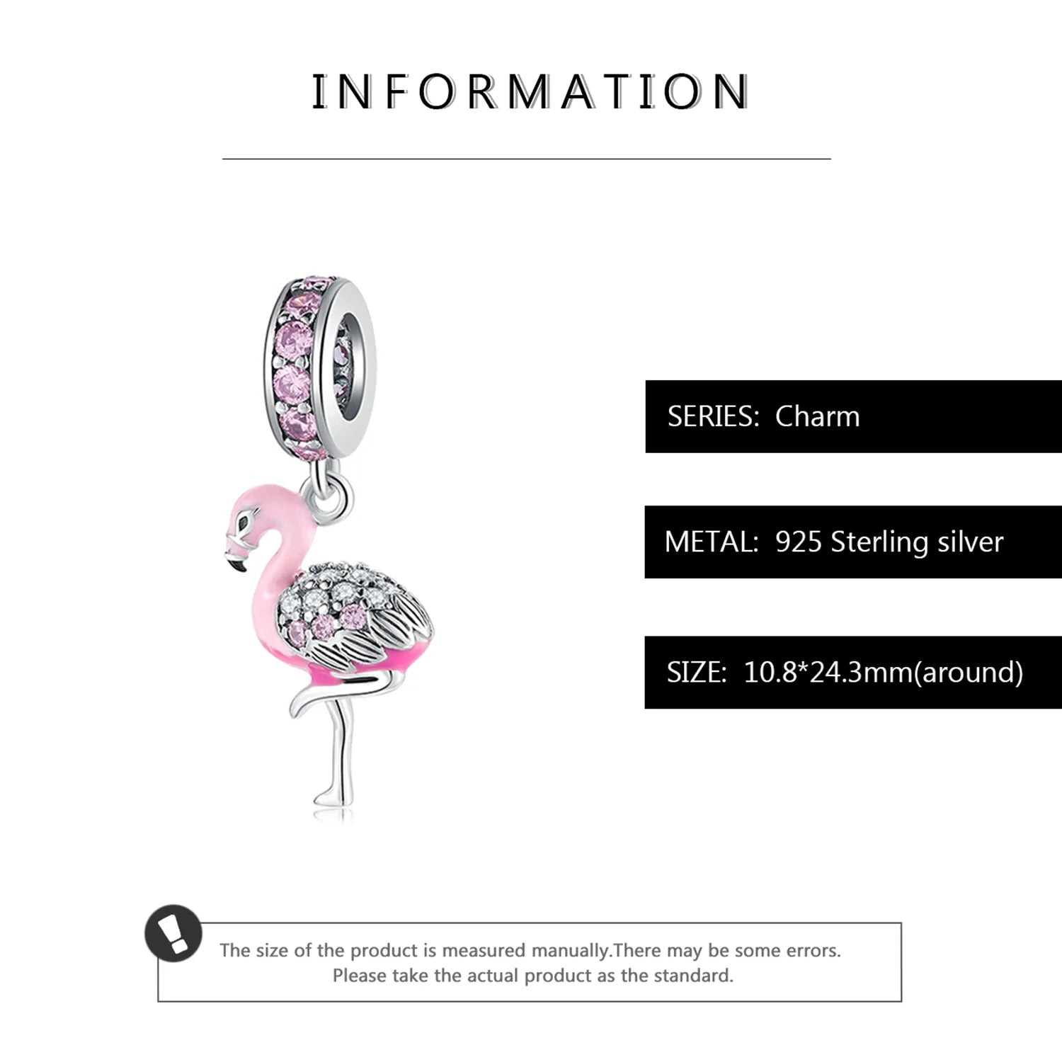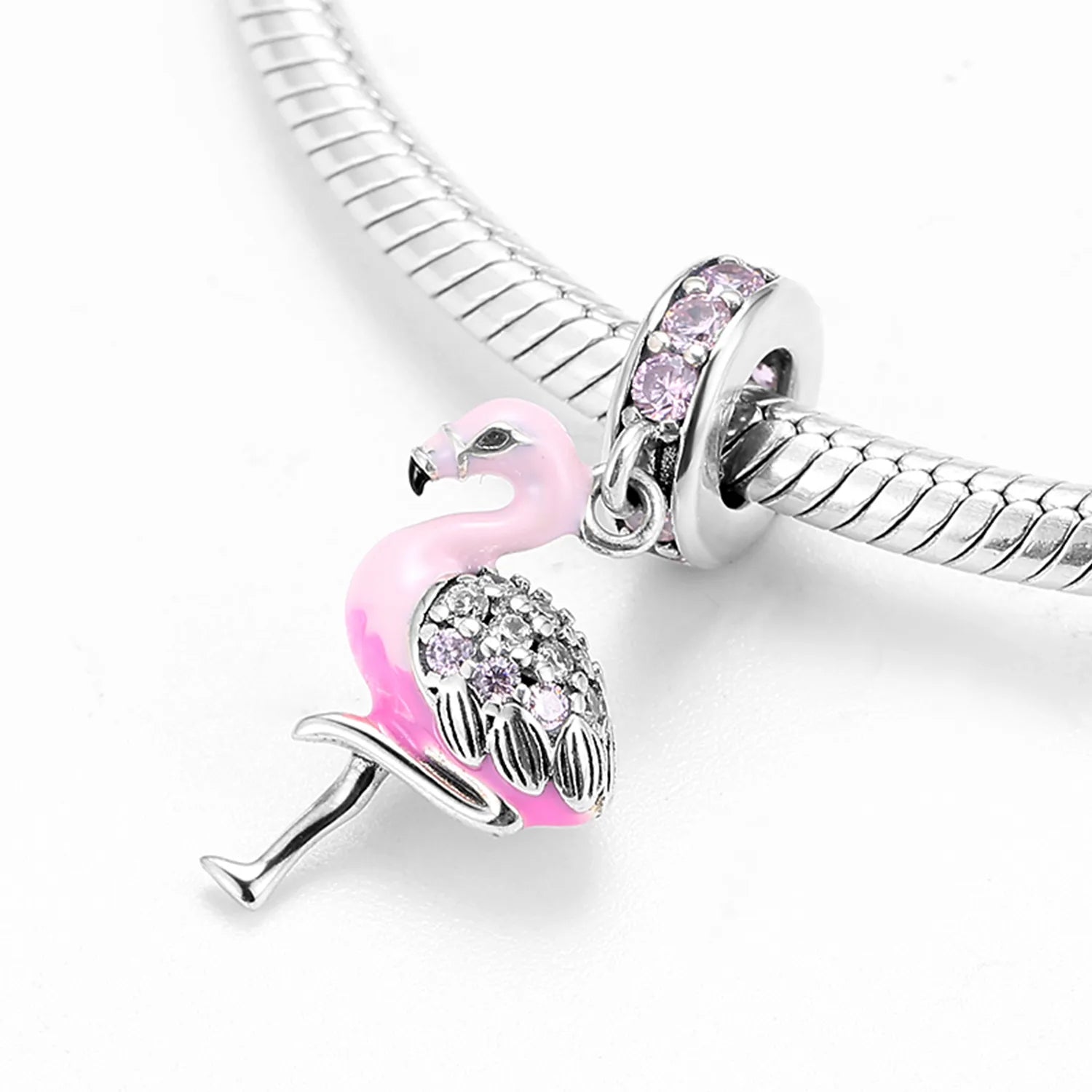 The Flamingo charm brings tropical elegance to your bracelet. Its pink gradient enamel body and shimmering stone-studded wings create a playful yet refined look. Standing naturally on one leg, this flamingo captures grace and charm in one beautiful miniature design. Perfect for summer themes, holiday moods, and lovers of bright, feminine pieces.