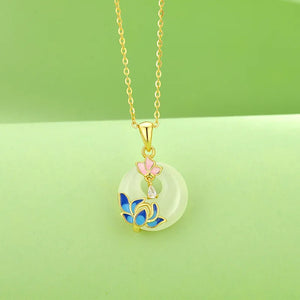 Enamel Lotus Jade Circle Pendant Necklace