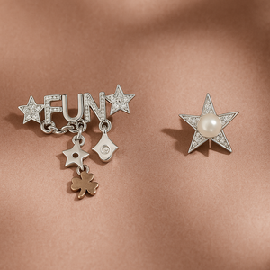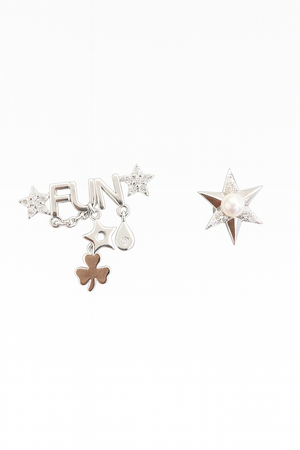 Joyful, stylish, and full of character — the Playful “FUN” Lucky Charm Earrings by Miora celebrate your inner sparkle. This quirky asymmetric pair features charming details like stars, teardrops, and a clover motif, symbolizing luck and positivity. Each piece is intricately crafted to bring a smile to your day and a shimmer to your look.