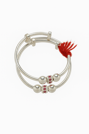 Made from genuine 925 Sterling Silver, these kadas feature delicate beaded detailing with a pop of color in red or greencubic stones — symbolizing prosperity and good health. A soft red thread enhances its traditional appeal, making it an auspicious addition for newborn ceremonies, milestones, or gifting.