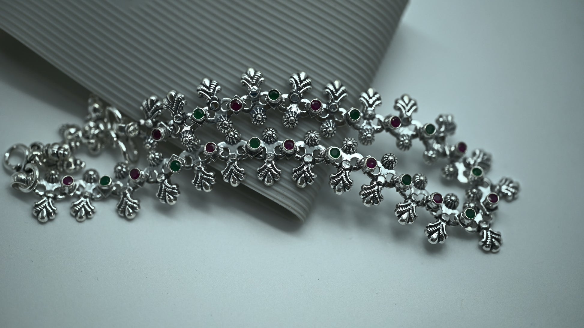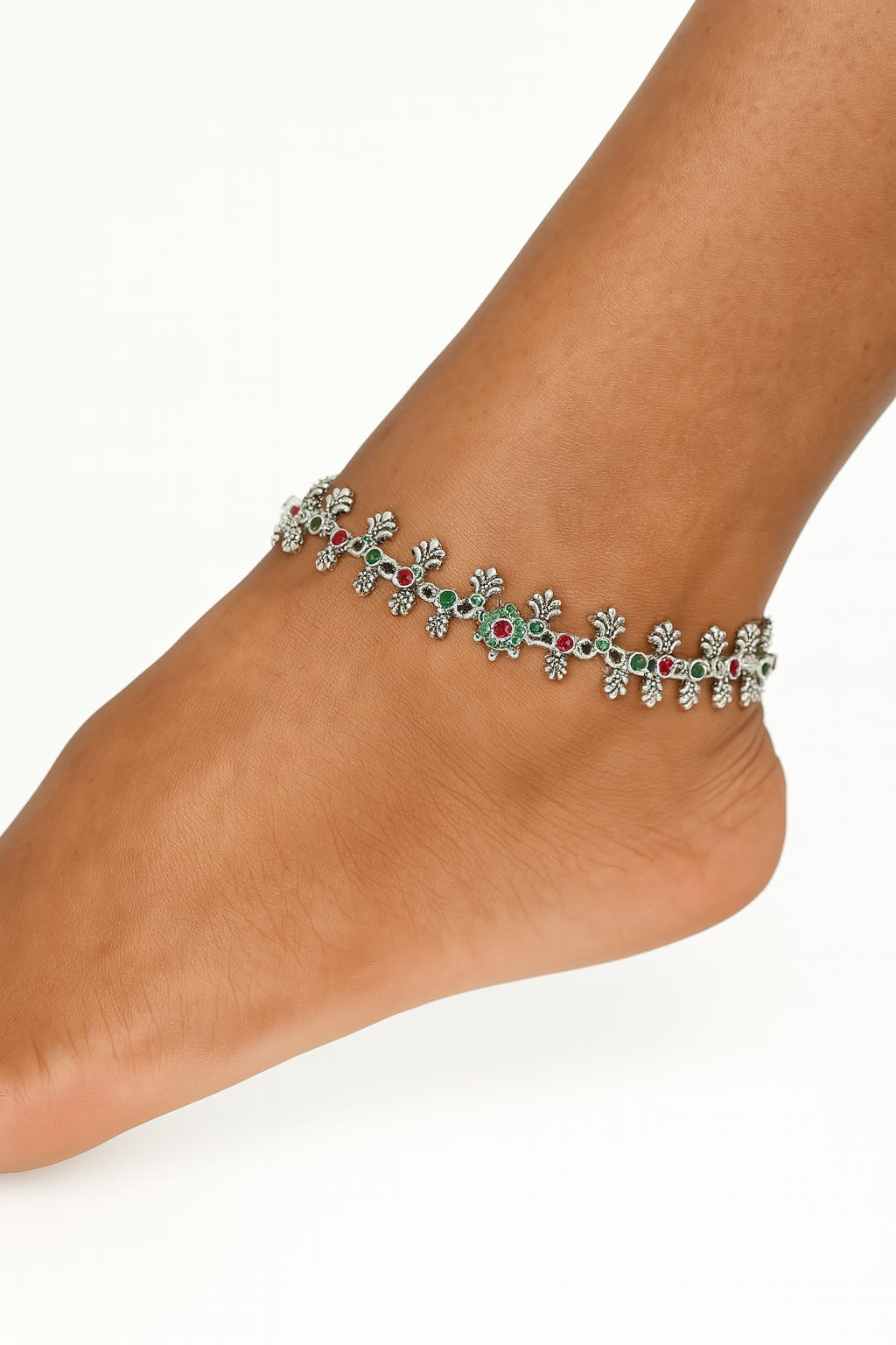 Embrace timeless heritage with Miora’s Antique Floral Anklet — a stunning piece inspired by traditional Indian artistry. Crafted in fine oxidized silver, this anklet features intricate floral motifs adorned with alternating green and maroon stones, adding a royal charm to every step. The beautifully detailed leaf-shaped danglers lend it a rhythmic grace that enhances its ethnic appeal.