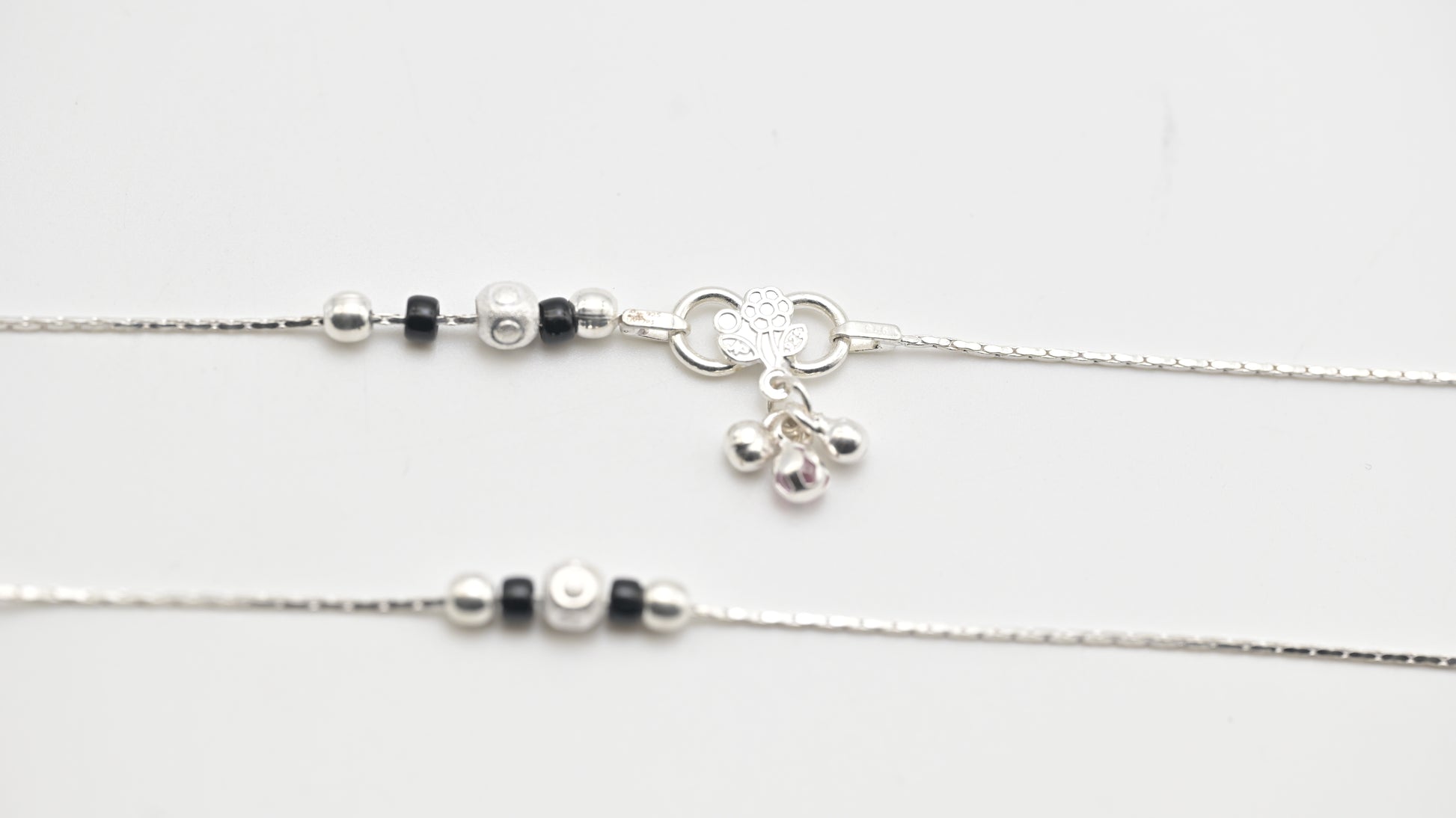 Enhance your ethnic charm with this elegant 925 Sterling Silver Payal featuring classic black and silver beads. Expertly handcrafted, this anklet showcases fine detailing with a flower link center and delicate dangling silver ghungroo charms that add a subtle jingle to your steps. Made from pure sterling silver, it’s lightweight, skin-friendly, and perfect for daily wear or traditional occasions.