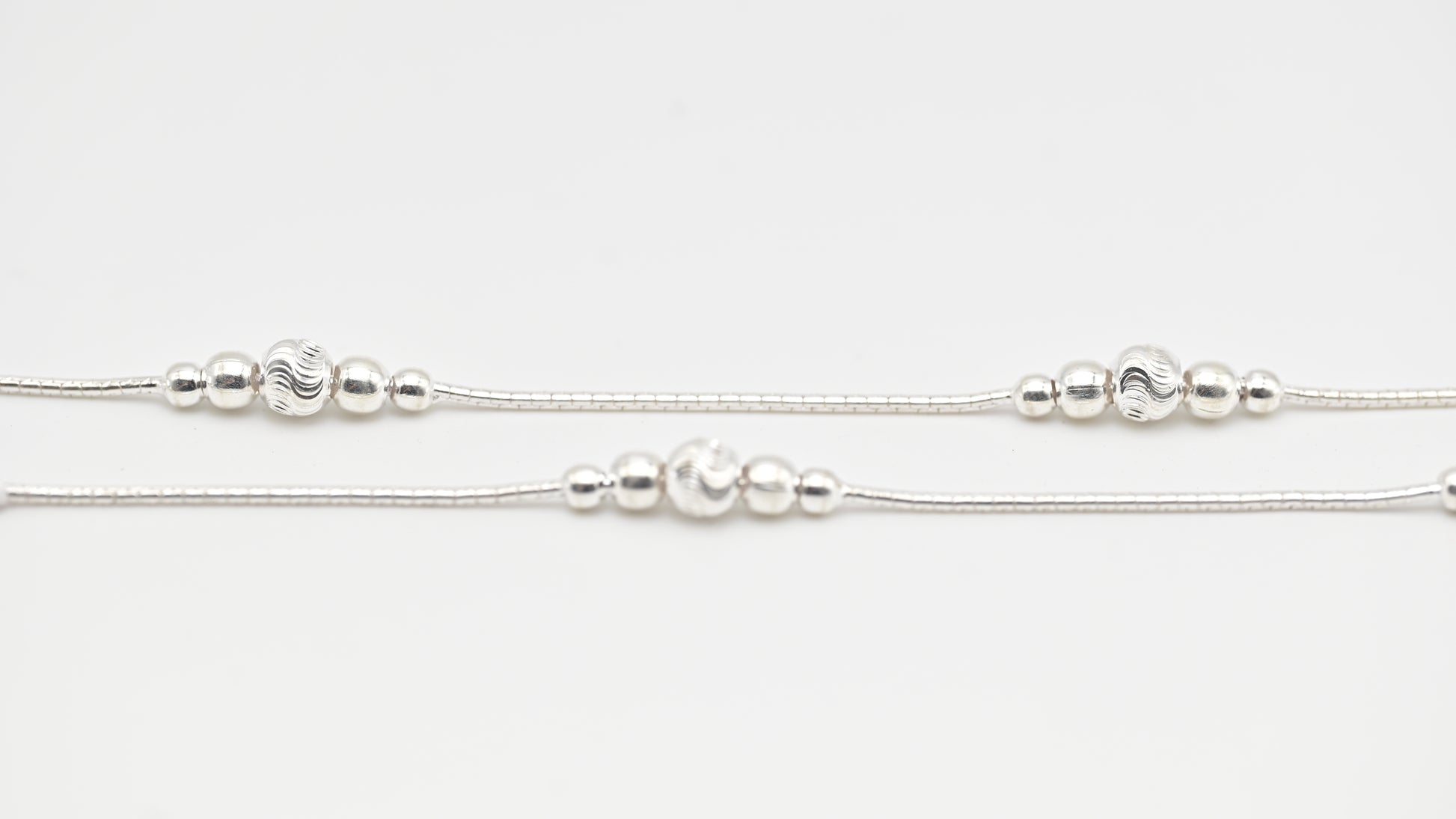 This elegant pair of silver anklets is designed to blend simplicity with timeless charm. Each anklet features a sleek snake-chain pattern adorned with smooth and textured silver beads at intervals, creating a graceful and refined look. Perfect for both daily wear and festive occasions, this payal adds a subtle sparkle to your step.