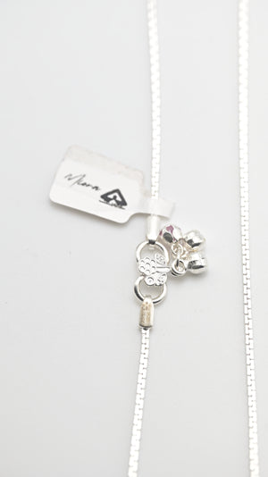 Add a touch of sophistication to your everyday style with this Sterling Silver Box Chain Anklet. Crafted with a sleek, reflective finish, the anklet features a delicate floral charm at the center, complemented by tiny silver beads for a graceful jingle effect. Its fine box-link chain ensures both durability and shine, making it perfect for daily wear or special occasions.