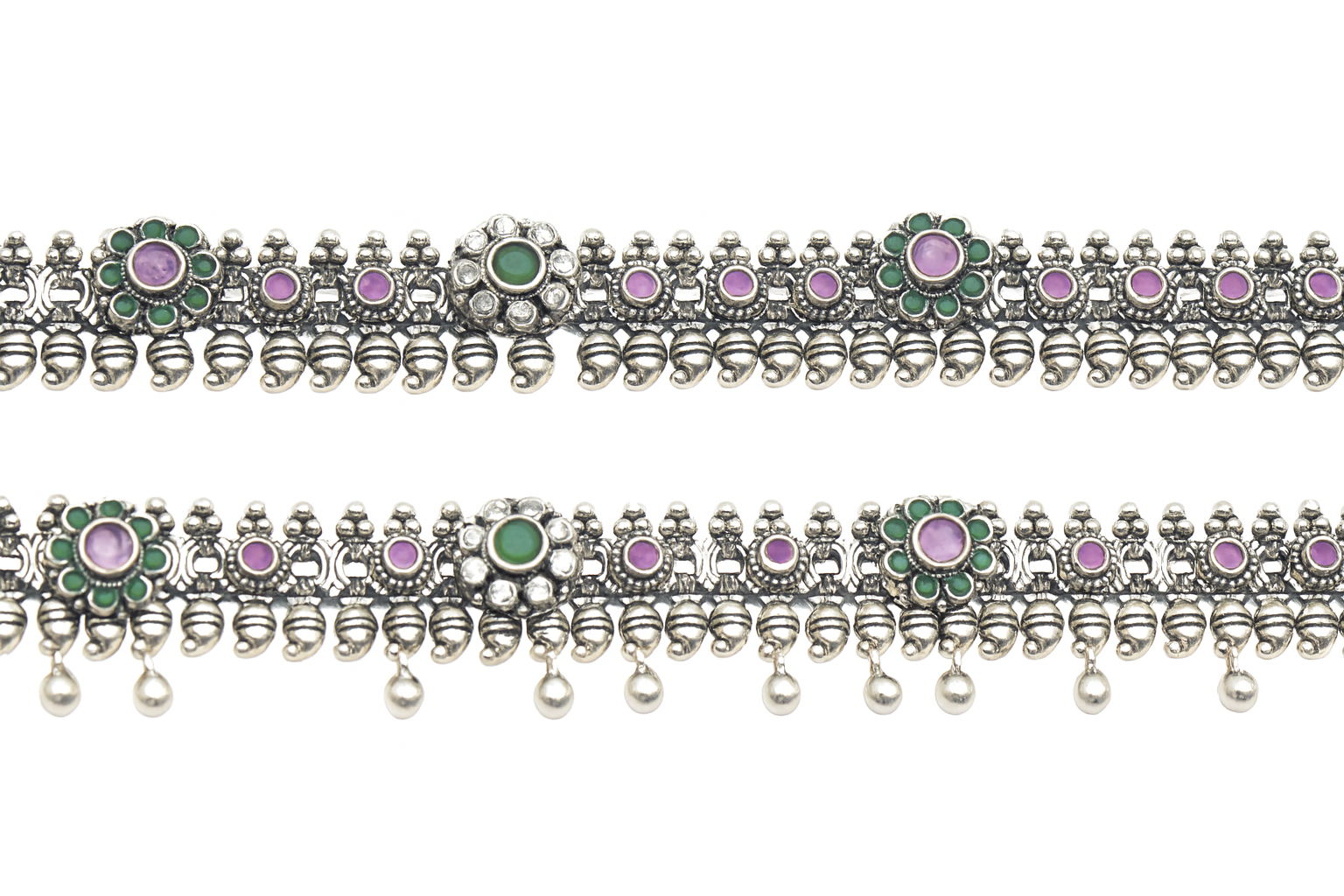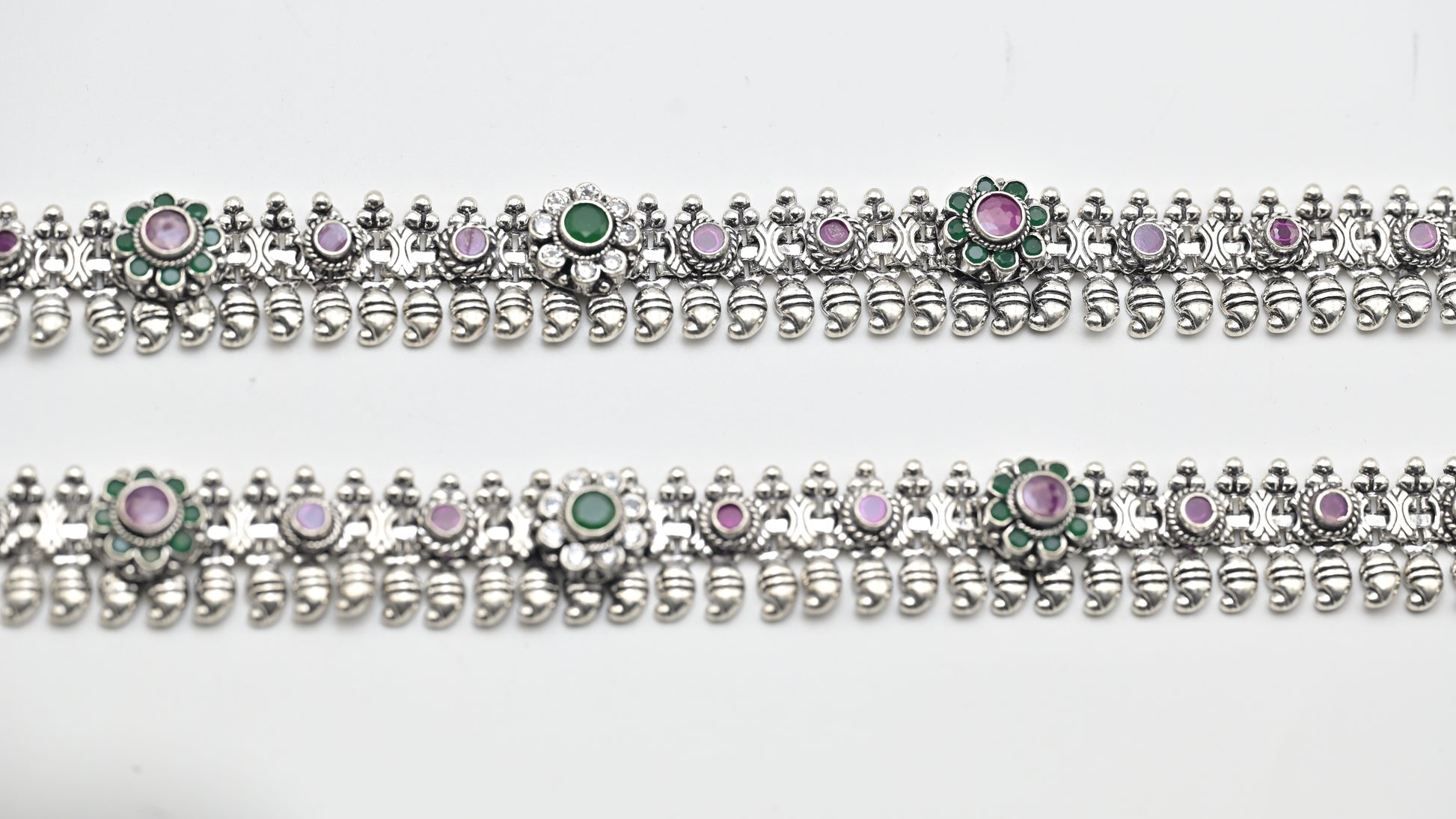 Enhance your ethnic charm with this Traditional Oxidised Silver Anklet, beautifully adorned with purple and green stones set in intricate floral motifs. The anklet features fine detailing with beaded edges and engraved patterns that exude a handcrafted vintage appeal. Perfect for pairing with sarees, lehengas, or festive wear, this anklet adds a graceful and elegant touch to any traditional outfit.