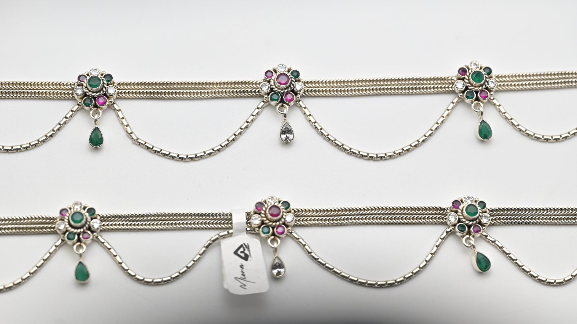 Embrace timeless elegance with this stunning pair of handcrafted sterling silver payals. Designed with intricate floral motifs adorned with sparkling ruby-red and emerald-green stones, these anklets exude classic charm and cultural beauty. The double-layered chain design with delicate hanging droplets adds a graceful drape around the ankle, perfect for festive wear or traditional occasions.
