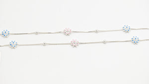 Bring a playful touch of colour and charm to your look with this vibrant Miora anklet. Adorned with alternating pink and blue enamel floral motifs, this delicate chain captures the beauty of summer blooms in a minimal, modern style. The fine silver finish adds a luxurious shine, while the dainty flowers create a refreshing and youthful vibe. Perfect for daily wear or to add a pop of elegance to your casual outfits.